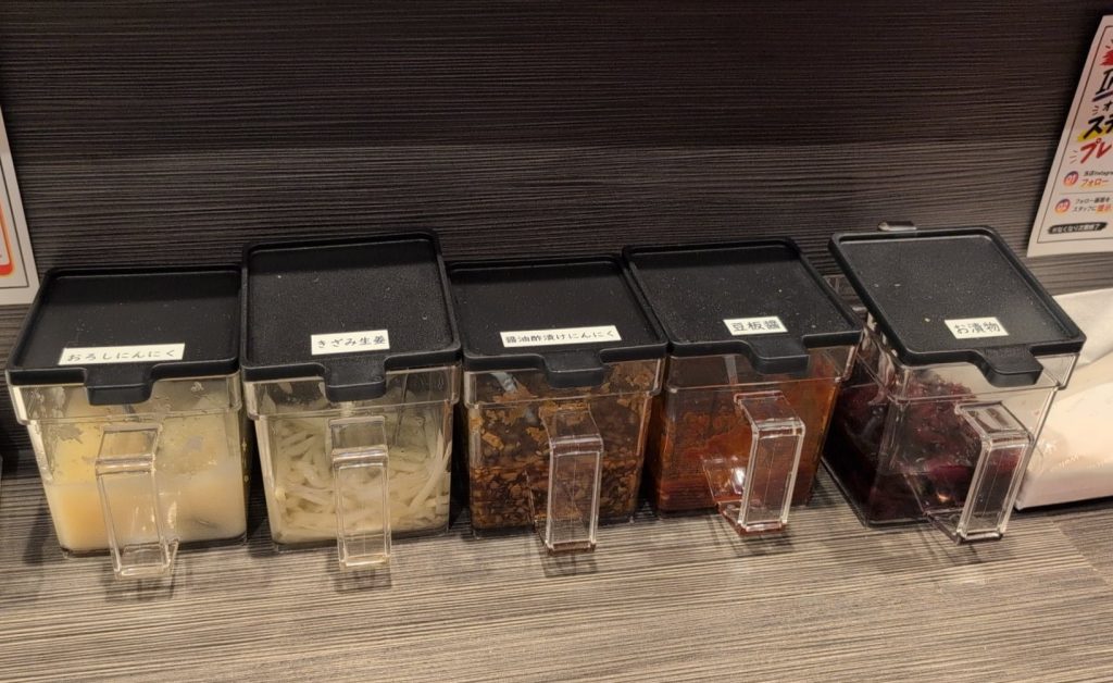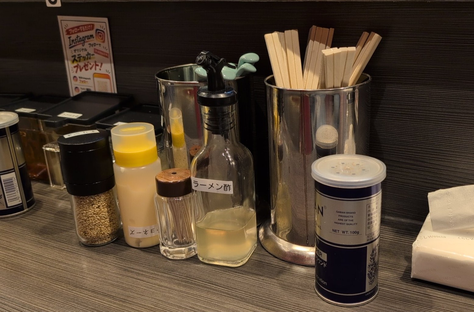 カウンターの薬味を見ると、こちらもラーショというよりは家系のラインナップに近いですね。